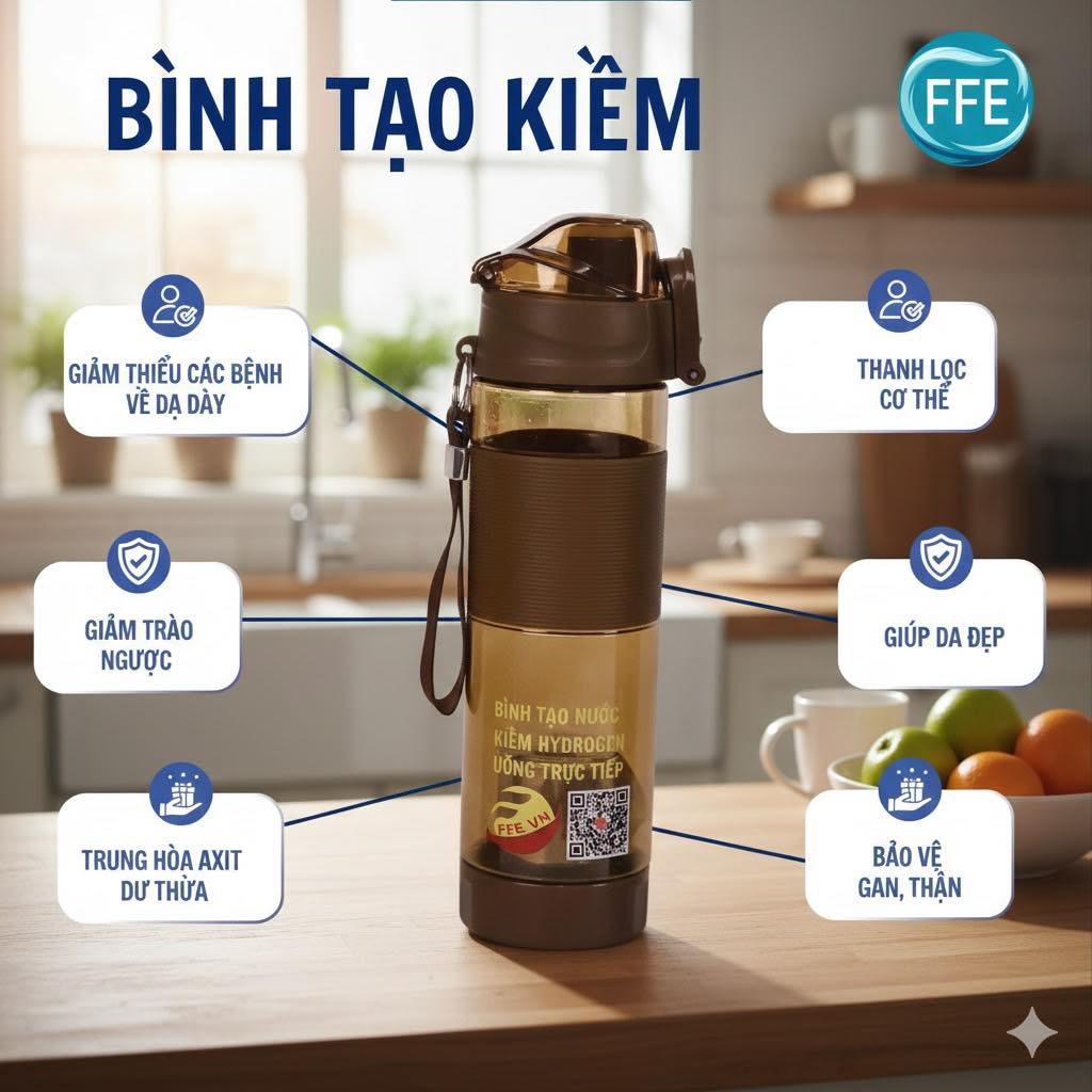 Bình tạo kiềm FFE hoạt động dựa trên nguyên lý lọc – bổ sung khoáng – điều chỉnh pH tự nhiên, không dùng điện, không tạo nước kiềm mạnh. Đây là giải pháp nước uống tiện lợi, an toàn và phù hợp với sinh hoạt hằng ngày của nhiều gia đình Việt.